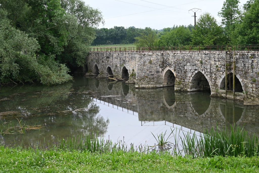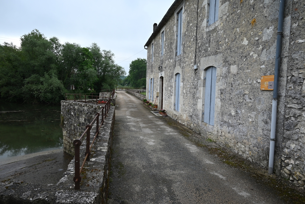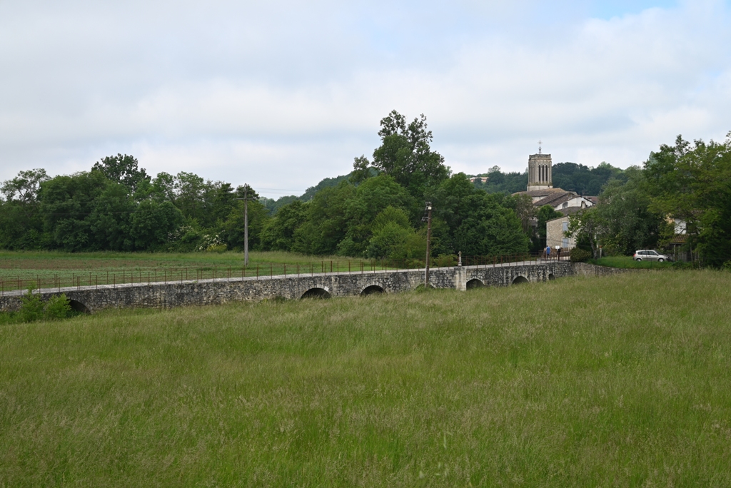 J’arrive par le vieux pont médiéval sur le Dropt, dit « vieux pont » ou « pont romain », il comprend 23 arches dont onze de style roman et douze de style gothique. C’est un très bel ouvrage. 1